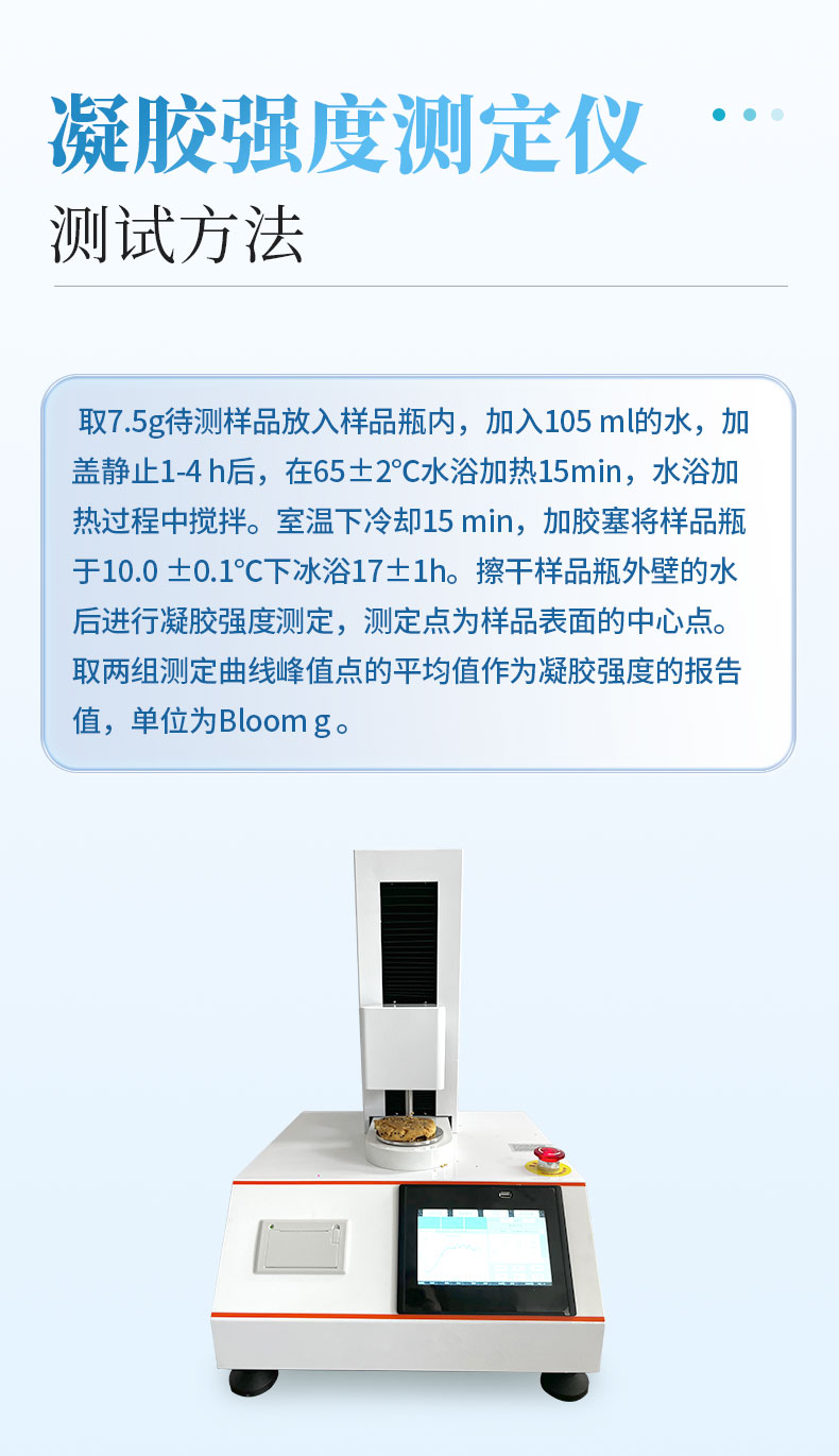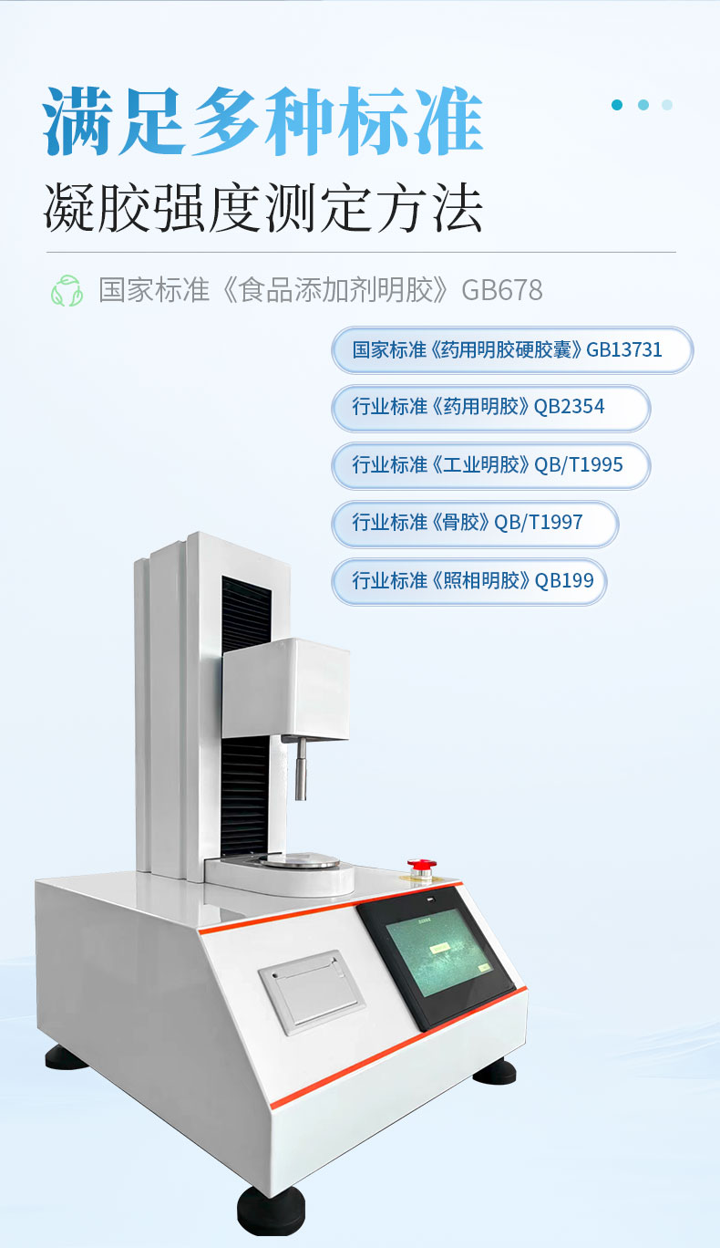 凝膠強度測儀適用于凝膠、果膠、硅膠、結(jié)冷膠、卡拉膠、瓊脂、阿拉伯膠、黃原膠、魔芋膠和瓜爾膠等的破裂強度、彈性、延展性、拉伸強度、粘附度、回復(fù)性等測試。凝膠強度測儀也叫凍力強度儀 ,明膠凝凍強度測定儀,組織分析儀或凍力測試儀。滿足標準:1、國標GB6783-2013 《食品添加劑明膠》中有關(guān)于凝膠強度的