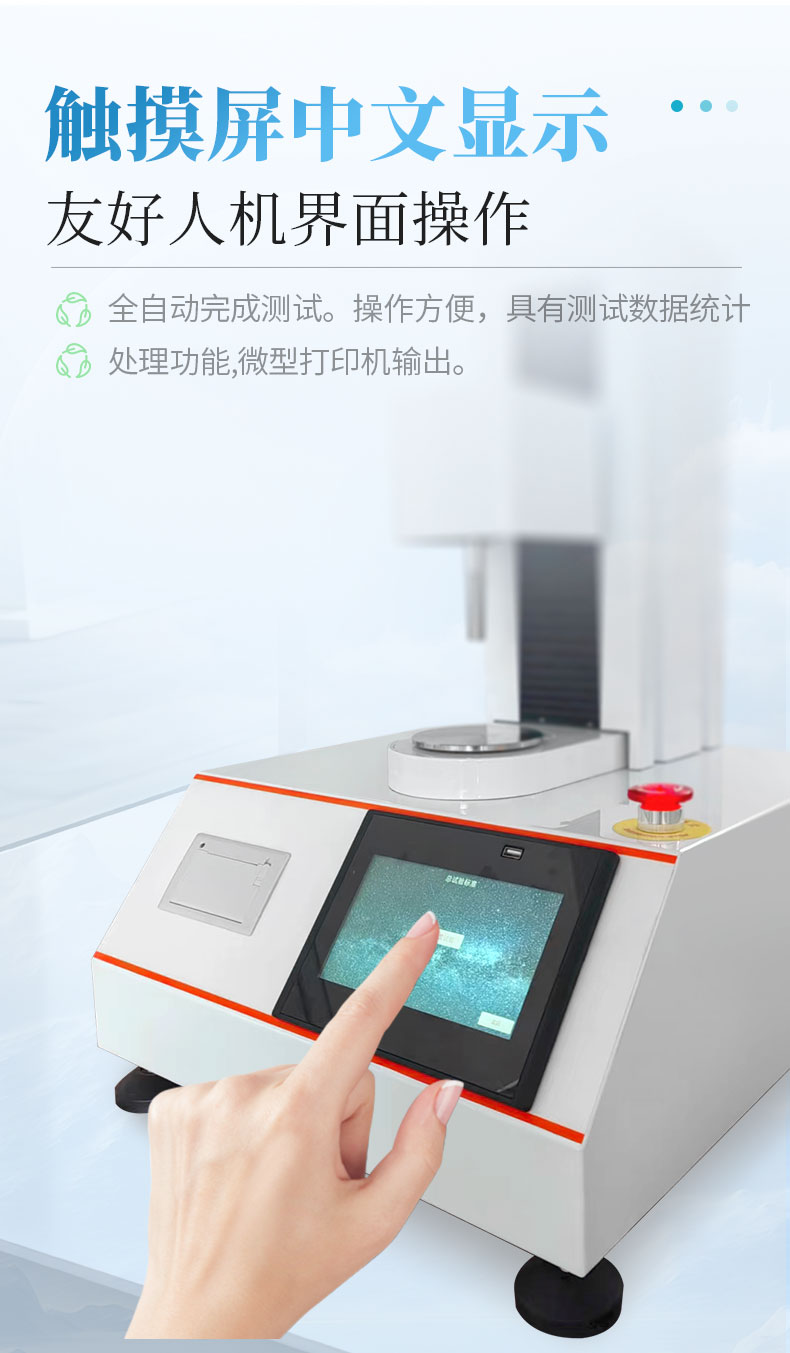 3、大觸摸屏中文顯示,友好人機界面操作。實時顯示測試曲線,全自動完成測試。操作方便,具有測試數(shù)據(jù)統(tǒng)計處理功能,微型打印機輸出。